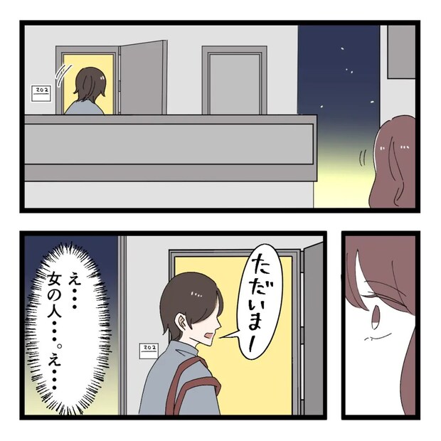 結婚が決まったのにヒロトさんが一度も家に連れていってくれないことや、会社の人とルームシェアしていると聞いているけれど紹介してくれないことで何かあるのかと不安になり、こっそりヒロトさんの家を見に行ったアユミさん。すると、ヒロトさんの家に「ただいまー」と言って入って行く女性の姿を見てしまい「え・・女の人・・。え・・」とアユミさんは衝撃を受けます。
