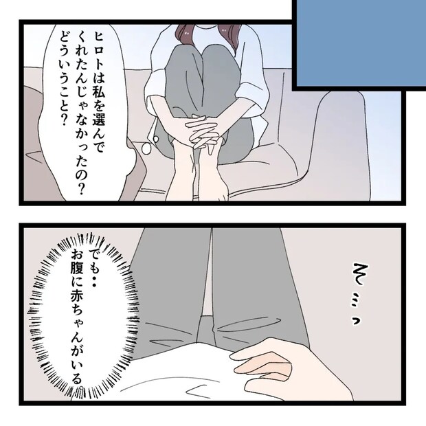 「ヒロトは私を選んでくれたんじゃなかったの?どういうこと?」ヒロトさんに彼女がいたことは知っていたものの、結婚が決まったことでヒロトさんは彼女よりも自分を選んでくれたのだと思っていたアユミさん。ヒロトさんと彼女の関係がずっと続いているのかもしれないと不安になるアユミさんは「でも・・お腹に赤ちゃんがいる」とそっとお腹に手を当てます。