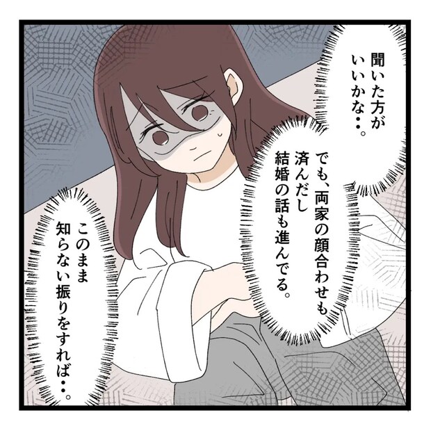 「聞いた方がいいかな・・。でも、両家の顔合わせも済んだし結婚の話も進んでる。このまま知らない振りをすれば・・」アユミさんは事を荒立てなければこのまま結婚できると思い、ヒロトさんに何も聞きませんでした。