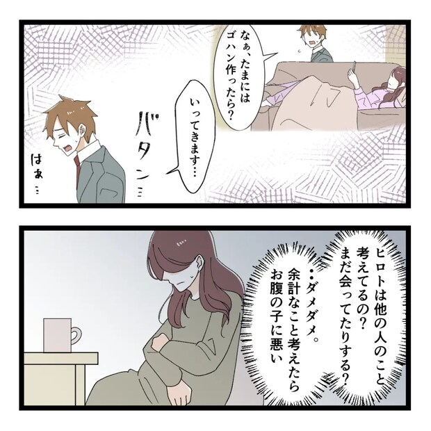 しかし、結婚生活が始まるとつわりで体調が優れないこともあり、溜息をついたりするヒロトさんを見る度に不安な気持ちが募るアユミさん。不安な気持ちからヒロトさんにも冷たい態度を取ってしまいます。「ヒロトは他の人のこと考えてるの?まだ会ってたりする?・・ダメダメ。余計なこと考えたらお腹の子に悪い」アユミさんはヒロトさんに素直に聞くこともできず、ずっと一人で思い悩んでいました。
