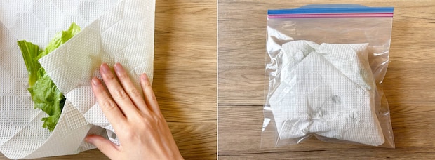 2. レタスをキッチンペーパーで包み保存袋に入れ、冷蔵庫の野菜室に入れる