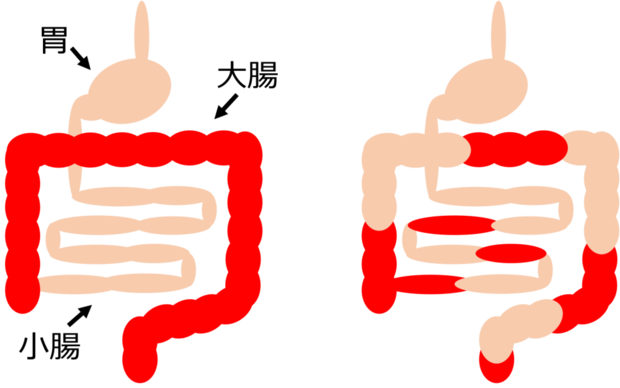 左:潰瘍性大腸炎右:クローン病(赤:炎症部)