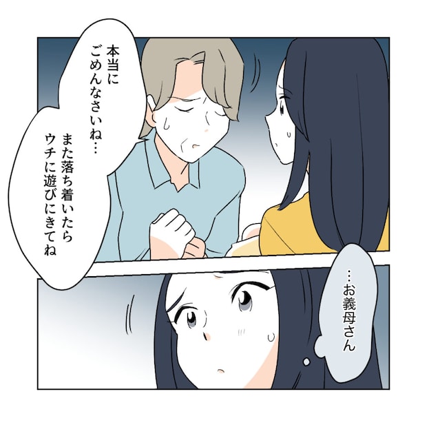 義母は私に声をかけると、「本当にごめんなさいね、また落ち着いたらウチに遊びにきてね」と申し訳なさそうに言います。義母は何も悪くないのに義父のせいでこんなに落ち込んで・・・私は胸がギュッと締め付けられました。