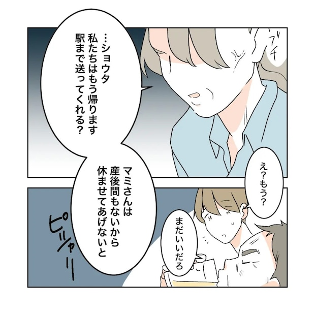 度重なる義父の非常識な言動に、ついに義母の堪忍袋の緒が切れたようで、「私たちはもう帰ります、駅まで送ってくれる?マミさんは産後間もないから休ませてあげないと」とショウタに向かって冷たく言いました。その言葉に、ショウタは驚き「え?もう?」と声をあげます。