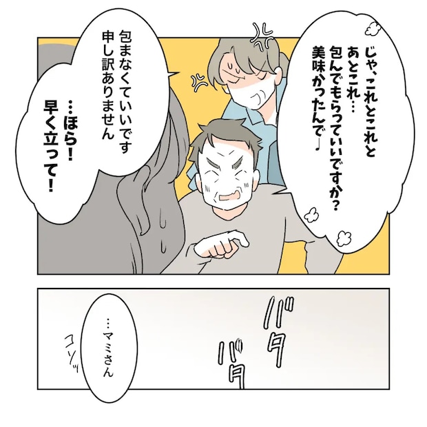 「じゃ、これとこれと・・・包んでもらっていいですか?美味かったんで」自分の非常識な振る舞いが原因で早く帰ることになっているのに、まったく気付かず能天気に言う義父。義母は義父の服をガシッと掴み、「申し訳ありません、ほら早く立って!」と急かします。