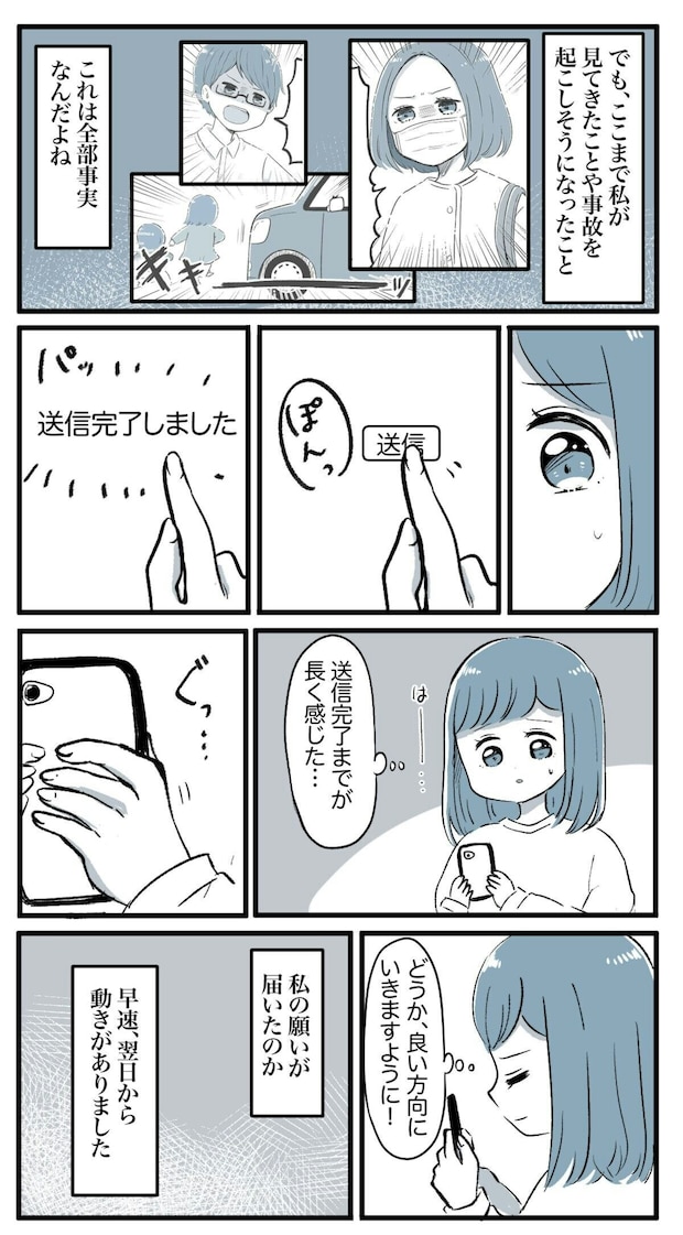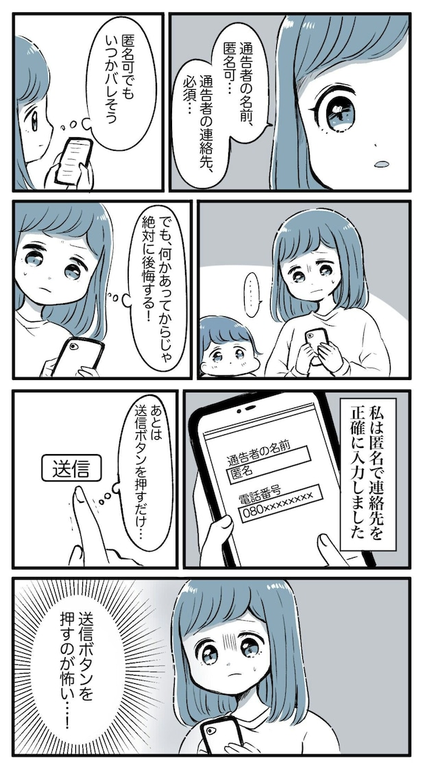 実際に虐待とみられる行為を目撃しても、自らの手で通告するときには恐怖を感じるもの。それでも、自分が見てきたことは事実と、心を決めて送信ボタンを押したのでした。
