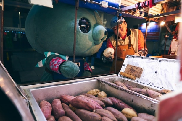 提灯の明かりを揺らしながら「♪い~し~や~き~いも~」とトラックが到着。エプロンとアームカバーを装着し準備万端だが、店主の説明は右から左へ。