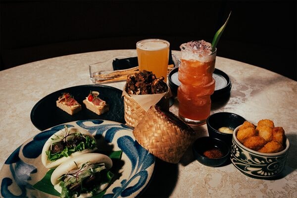 葉巻に見立てたスナック「ムラサチ・ロブスト」をはじめ、海ぶどうや島豆腐、パイナップルポークなど、沖縄の素材にアジアのエッセンスを重ねた、カクテルの余韻と美しいハーモニーを生み出す一皿が味わえる。
