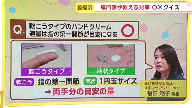 スタジオでは「えっ、そんなに多くていいの?」「いつも米粒くらいしか使ってなかった」と驚きの声が上がりましたが、たっぷりと使うことが手荒れを防ぐ第一歩です。