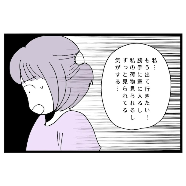 久しぶりに義実家へ帰ってきた美月さん。最近結婚した義兄カズヤさんが住む予定の新居を見学していると、突然義母から「この家に住まない?」と提案され、理由を聞くと、義兄が単身赴任で急遽県外へ行くことになったそう。夫タクヤさんに相談すると前向きな反応で、最終的に3年間だけカズヤさんの家に住むことに決めました。しかし引っ越し当日、荷物の搬入と片付けを終え義実家で夕飯をご馳走になっていると、仕事から帰ってきたカズヤさんに「単身赴任もしないし結婚もないから」と言われ、美月さんは義母とタクヤさんに騙されていたと気づきました。ショックを受けるも、引っ越した以上ここで暮らすしかないと腹を括って敷地内同居生活が始まるも、美月さんに断りもなく合鍵を使って家に入ったり、美月さん宛の荷物を勝手に開封して中身を確認するなど、プライバシーの欠片もない行動を繰り返す義母。そんなある日、美月さんが洗濯物を干しているとご近所さんと話す義母の声が。「仕事は辞めてもらう」「孫の世話をしたい」と義母が言い、嫌な予感がしてタクヤさんを問い詰めると「ただの世間話だろ」と言われてしまいました。翌朝起きてカーテンを開けると、隣の家の窓から義母がこちらを見ていてビックリ!また突然美月さん宛の荷物が届き驚いていると、「美月ちゃんの名前借りちゃった」と美月さんとお揃いの下着を買ったと言われ寒気が。その後も勝手に家に入ったり、深夜に電話をかけて来たりと、義母の行動に「この家ずっと見てるの?」とイライラが止まりませんでした。