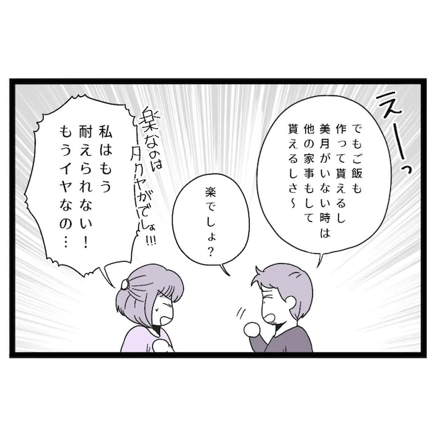 「えーっ!でもご飯も作ってもらえるし、美月がいない時は他の家事もしてもらえるしさ~。楽でしょ?」タクヤに平然と言われ、「楽なのはタクヤがでしょ!!!私はもう耐えられない!もうイヤなの・・」と訴えました。