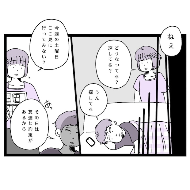 「ねぇ、どうなってる?探してる?」休日もソファに寝っ転がっているだけのタクヤにそう言うと、「うん。探してる」と空返事するタクヤ。