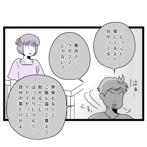 すると、「はぁ・・しつこい探してるよ!!分かってる!」「美月さ・・ワガママじゃない?家賃もなくてご飯も届けて貰えて助かることばっかりじゃん!!イヤイヤって自分の事だけかよ」と呆れたように言った後、