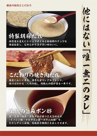 しゃぶしゃぶを味わうこだわりのタレは、焙煎度を変えたトリュフオイルと数種類のナッツを独自に配合した「特製胡麻だれ」、国産にんにくを贅沢に使った濃厚仕立ての「秘伝香味だれ」、鰹・昆布・椎茸の三大旨味成分(イノシン酸・グルタミン酸・グアニル酸)をひとしずくに凝縮した「伝統の旨味ポン酢」の3種類だ。