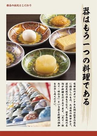 器もまた、料理の一部ということで、鍋には、佐賀・有田の窯元まで足を運び、特別に焼き上げてもらった“オリジナル有田焼”の土鍋を使用。そのほか、九谷焼の艶やかな彩りや、波佐見焼の温かみある風合いなど、日本を代表する焼き物の産地から、料理を最も美しく引き立てる器が厳選されている。