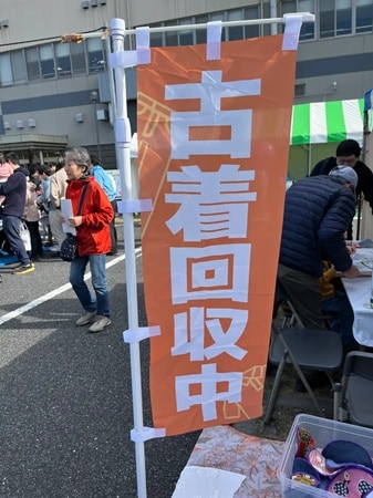 古着回収ブース。団体名入りテーブルクロスも古着から作られている。