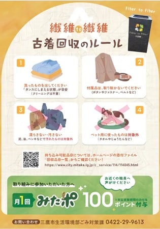 実施体制は、三鷹市が行政広報・会場提供、テキスタイルサーキュラーネットワークが企画統括・ブース運営・アンケート・レポート作成。もっかいトラストは、回収・保管・出荷を担当した。