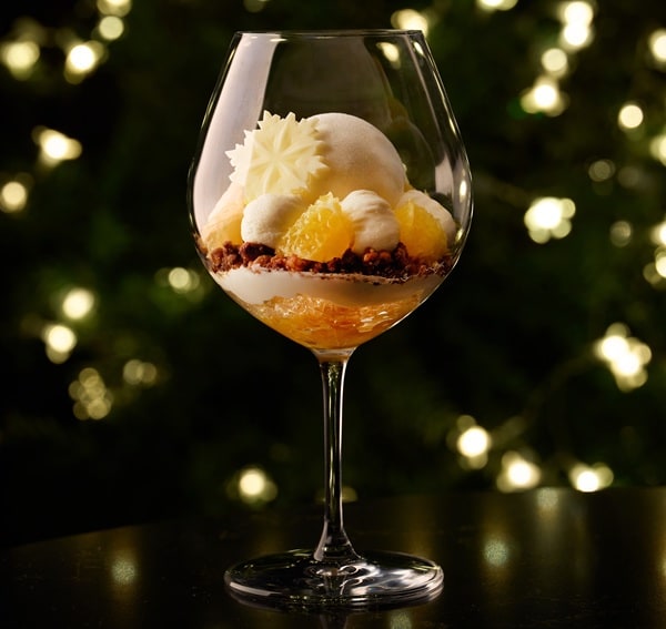 グラスの中段には、アーモンド、そして醤油とごまのクランブルが敷き詰められ、ザクザクとした食感とほのかな塩味が新しい味覚のアクセントに。底に忍ばせた2層のジュレには発酵オレンジと白ワインを取り入れ、軽やかで上品な甘さをひとつのグラスの中に凝縮。別添えのシェフ特製・発酵オレンジソースをお好みで加えれば、よりウェルネスなスイーツとして罪悪感なく楽しめる。
