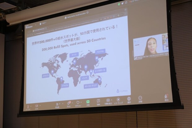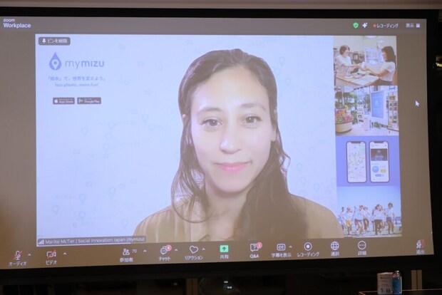オンラインで登壇したMariko McTier氏は、日本初の無料給水アプリ「mymizu」のこれまでの軌跡と今後の展開について発表しました。2019年の受賞当時から大きく成長し、現在は世界50カ国以上、20万箇所以上の給水スポットを掲載するプラットフォームへと進化。自治体や大手企業との共創プロジェクトを次々と成功させています。今後は、蓄積したデータを活用したライセンス事業や、熱中症対策としての給水スポット活用など、「環境問題を超えて人の命を守るインフラ」への進化を目指すと語りました。
