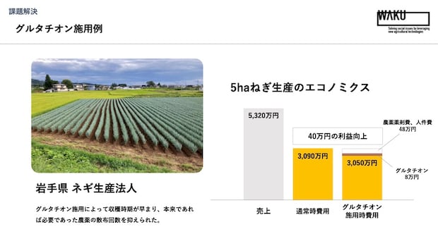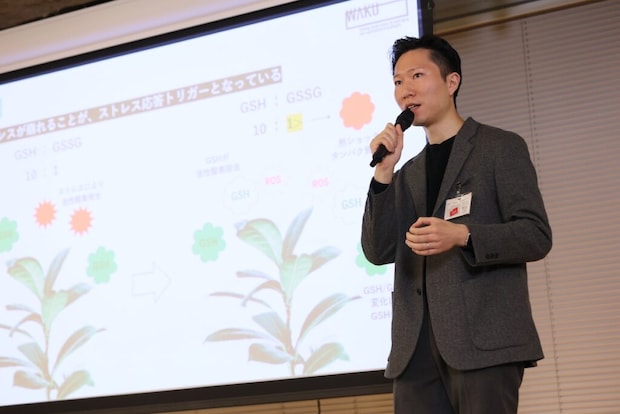 続いて登壇したのは、株式会社WAKUの姫野氏です。3年前の受賞時は林業苗への活用を提案していましたが、今回は「グルタチオン」の自社製造と農業利用へと大きくピボットした事業を発表しました。