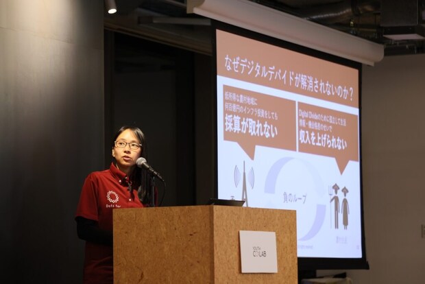 アフリカの農村部で通信インフラを提供する株式会社Dots forの外村氏は、デジタルデバイド(情報格差)の解消に挑む事業を紹介しました。「Dots for Box」というデバイスを村に設置し、通信環境だけでなく、独自の信用スコアを活用した家電やバイクの分割払いサービスなどを展開しています。