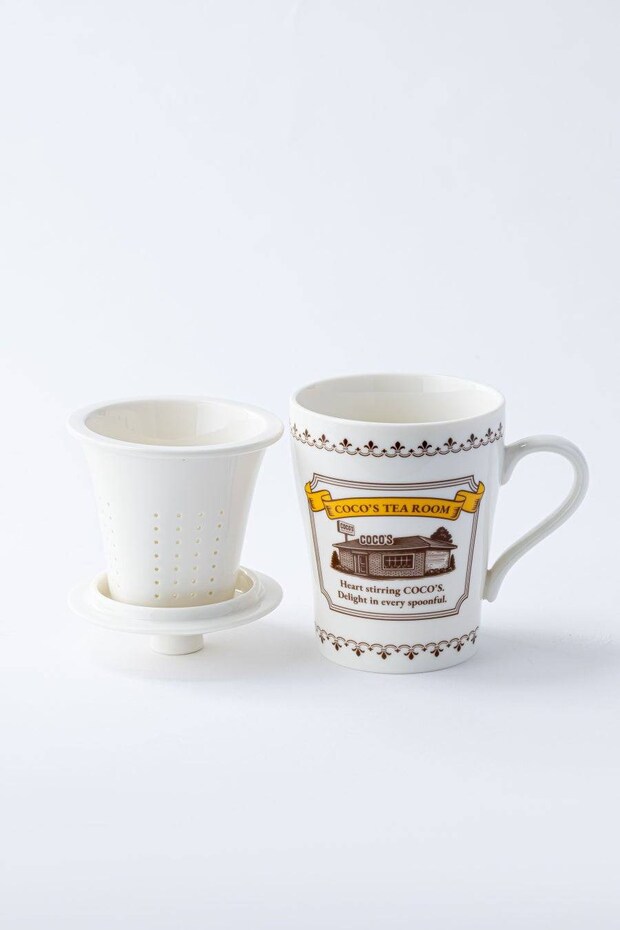 英国風のイラストが描かれた陶磁器製のマグカップ。茶こしと蓋付きで、紅茶を本格的に楽しめる仕様です。容量は380ml。紅茶だけでなくコーヒーやハーブティーにも使えます。