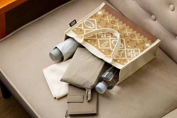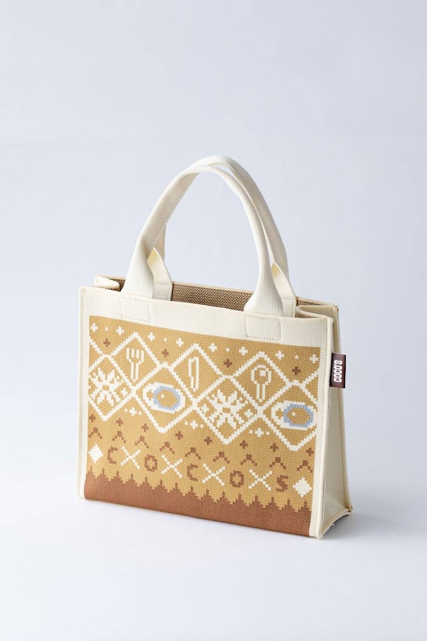 ココスの人気メニュー「包み焼きハンバーグ」をモチーフにしたノルディック柄のニットバッグ。 ブラウンを基調とした温かみのあるデザインで、冬のコーディネートにもぴったりです。