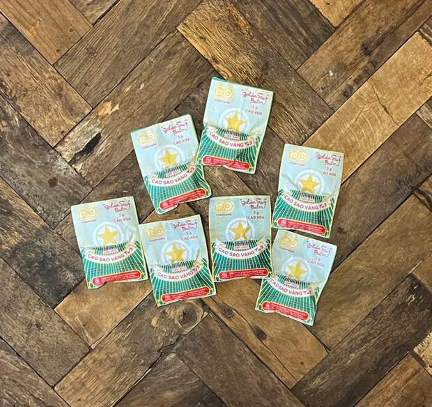 これまた旅を共にした方にオススメしてもらった「Cao Sao Vang」(ゴールデンスターバームとも呼ばれているそう」。筆者は【ロッテセンター ハノイ】の地下にある薬局で見つけたのですが、いわゆるベトナム版のメンソレータムです。どうやらタイガーバームを参考にしているそうですが、シナモンも含まれているか、日本人が慣れ親しんだメンソレータムとは一味違うベトナムらしさを感じる香りを楽しめます。