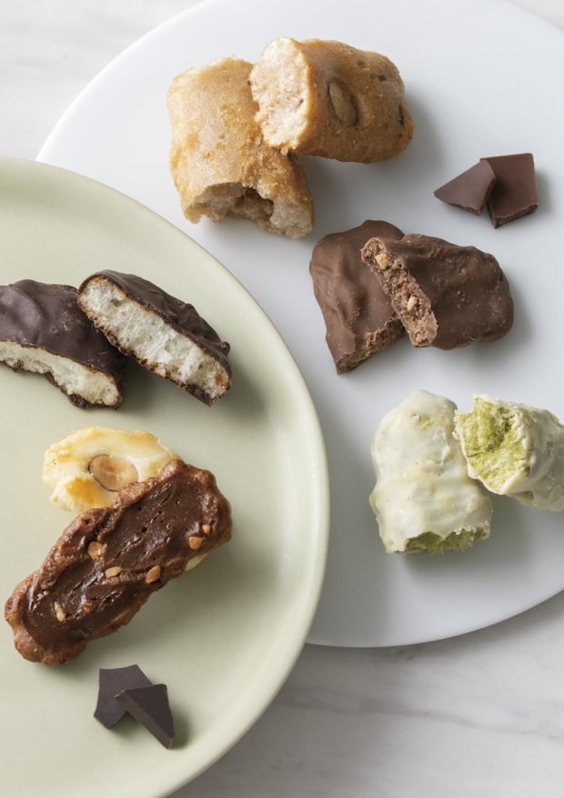 左上から時計回り「抹茶あられ」「ミルクチョコレートあられ」「ダークチョコレートせんべい」