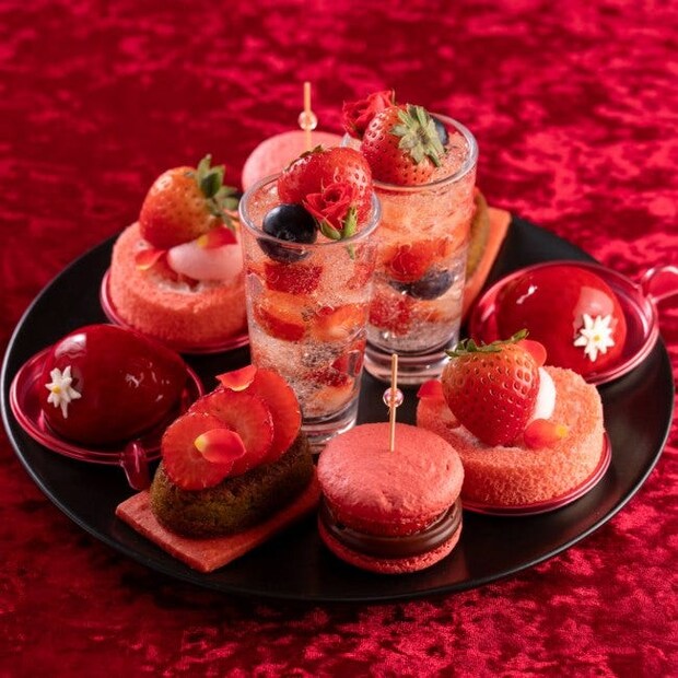 前半である今回のテーマは「苺と赤いバラ」。酸味が少なく甘みが際立っている栃木県産「とちあいか」を使用したスイーツが勢揃いする。味に深みのある、愛らしい見た目の「苺のジュレと洋梨とマルメロのムース」や、いちごを丸ごと1粒のせた「苺のロールケーキ」、華やかに仕上げられた「苺とピスタチオのタルト」など、魅惑的に装飾されたいちごスイーツがずらりと並ぶ。