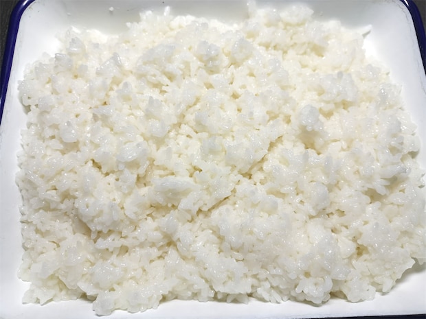 4. 広げたご飯に2のすし酢を振りかけて混ぜ、冷ましておきます。