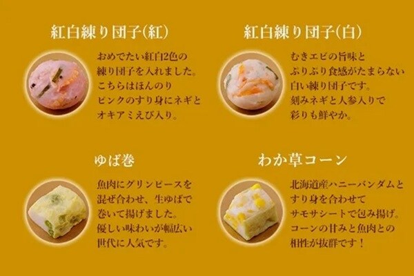 商品の特徴を紹介しよう。1つ目は、一口サイズで食べやすい、華やかな8種の手作りさつま揚げ。
