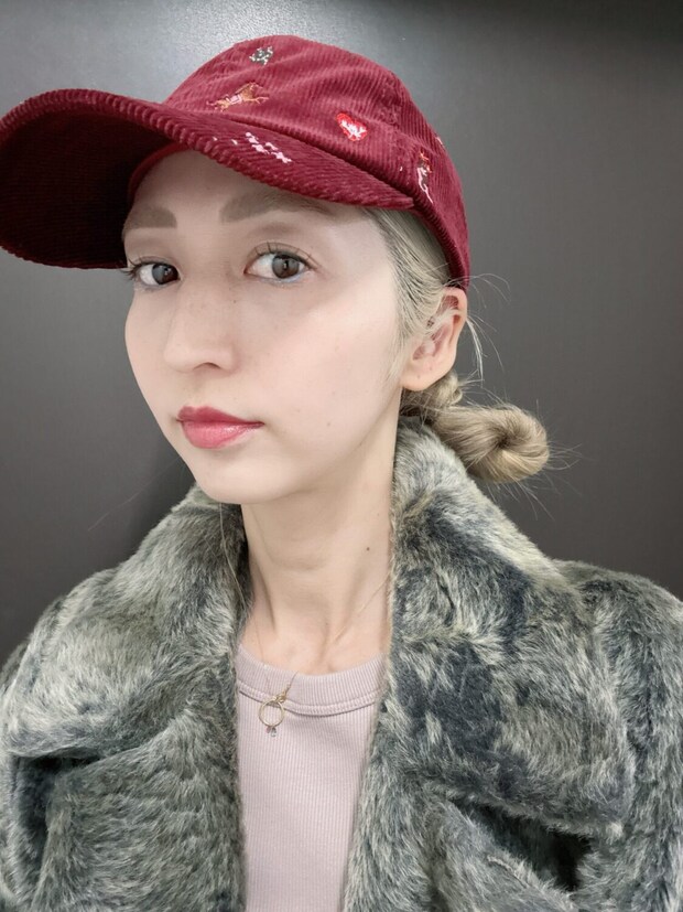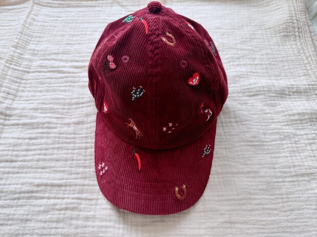 こちらはバーガンディのコーデュロイとキャッチーな刺繍が可愛いキャップ