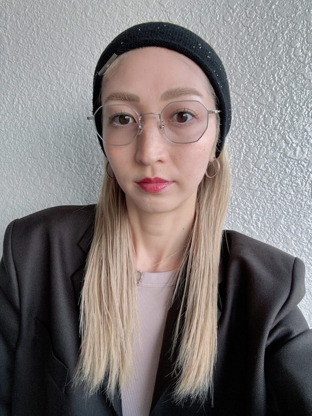 ブランドロゴと合わせてシルバーのピアスをつけてカッチリめな肩パッド入りのジャケットに、メガネを合わせて大人っぽくコーディネートしてみました