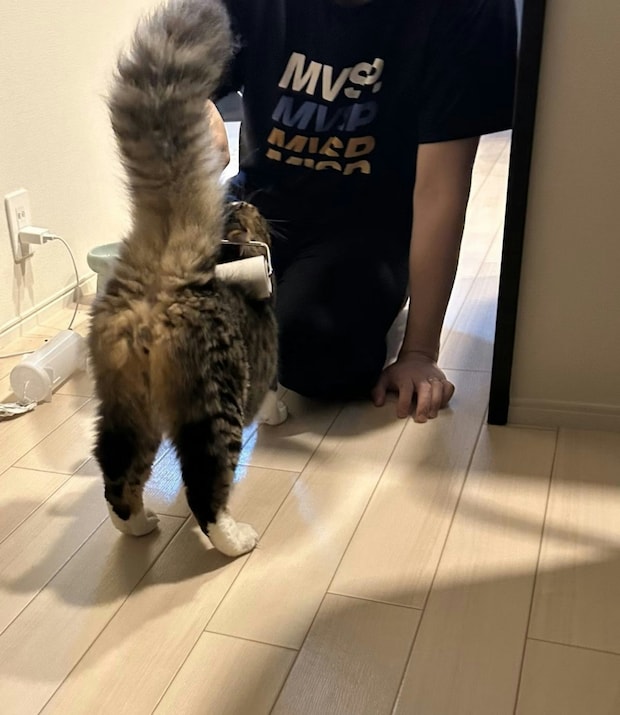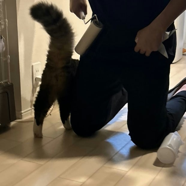 なんと、新品のコロコロは粘着力が強すぎるため、まず旦那さんが自分自身をコロコロ!こうすることで粘着力を適度に弱め、愛猫が痛くないように配慮しているのですね。そして、その隣で「次は自分の番だ」とばかりに待っている猫ちゃんの姿…なんとも愛らしいルーティンです。