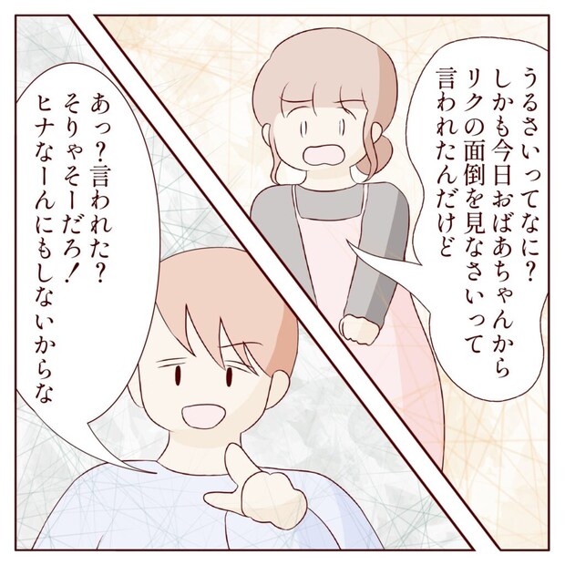 「うるさいってなに?しかも今日おばあちゃんからリクの面倒を見なさいって言われたんだけど」ヒナさんが義祖母に言われたことを伝えると、リクさんは鼻で笑いながら「そりゃそーだろ!ヒナなーんにもしないからな」と、バカにするように言い放ちました。