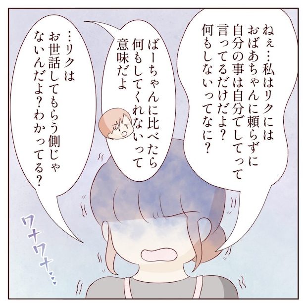 リクさんの態度に、ヒナさんの怒りはふつふつと湧きあがります。「おばあちゃんに頼らず、自分のことは自分でしてって言ってるだけだよ?」必死に感情を抑えてそう告げると、リクさんは「ばーちゃんに比べたら何もしてくれないって意味だよ」と、まるで響いていない様子。「・・・リクはお世話してもらう側じゃないんだよ?わかってる?」ヒナさんは、小さな子どもに諭すようにに言いました。