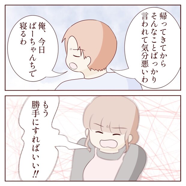 「帰ってきてから文句ばっかり言われて気分悪いわ、今日ばーちゃんちで寝る」リクさんはそう言うと、ヒナさんに背を向け、そのまま義祖母の家へ行ってしまいました。「もう勝手にすればいい!」取り残されたヒナさんは、声を荒げました。