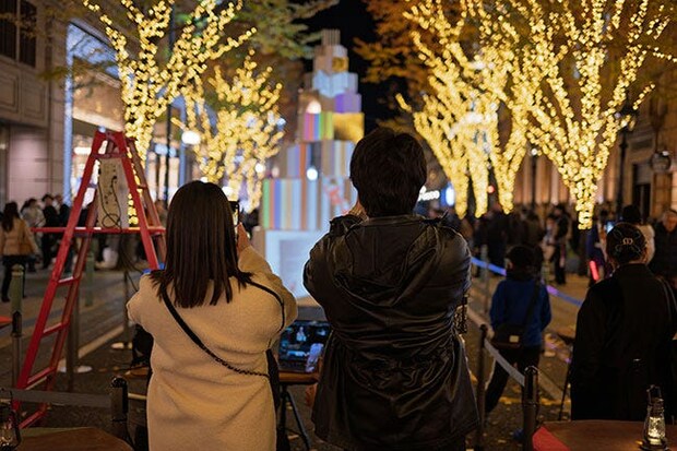 マーケットの中心に登場するのは、「旧居留地ホリデイズマーケット」を象徴するオブジェ。夜を迎えると“光のアート”に変身して、ますますフォトジェニックに。