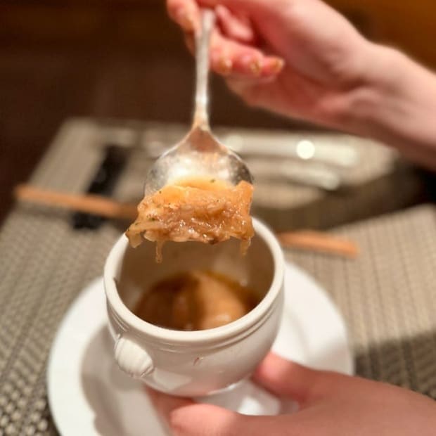 席に戻ってきたところで、ファーストディッシュが運ばれていました。肌寒くなってきた季節にぴったりの「コラーゲンたっぷりオニオングラタンスープ」です。