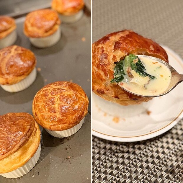 パイを割ると熱々のスープがお出まし。スープの中には、貝、じゃがいも、ほうれん草などの具材がぎっしり。スープはクリーミーでいながらあっさりとした後味で絶品です。