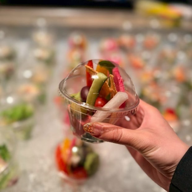 赤と緑でクリスマスカラーの「シーフードのマリネ トマトとバジルソース」。甘酸っぱさがありつつ、優しい味付けで食べやすい。プリプリのエビが入っているのも嬉しいです。