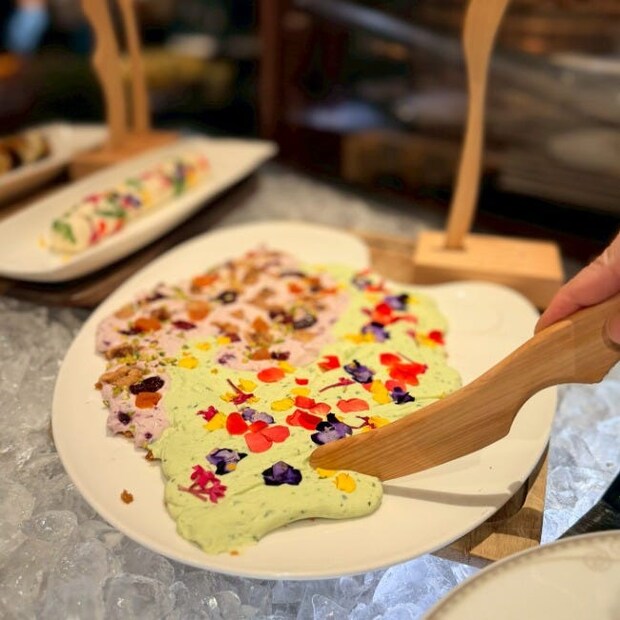 かわいらしい「クリームチーズのルーロー エディブルフラワーとナッツ&ドライフルーツ」。クリームチーズの酸味と、プチプチッとしたいちじくの食感、甘酸っぱいアプリコットの相性が抜群。
