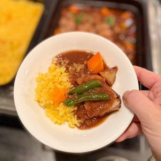まずは「四万十ポークシチュー サフランライスを添えて」を。シチュー自体は、コクがありながらも酸味がほんのり。お肉はトロッと柔らかく、よく煮込まれているのがわかります。そして、サフランライスの中には、星型にカットされたにんじんが! シチューとライスの相性がよくて、とてもおいしいです。