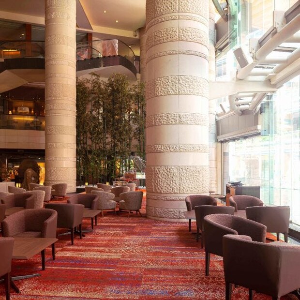 心地よい吹き抜けのバーでリラックスしながら贅沢なアフタヌーンティーを堪能