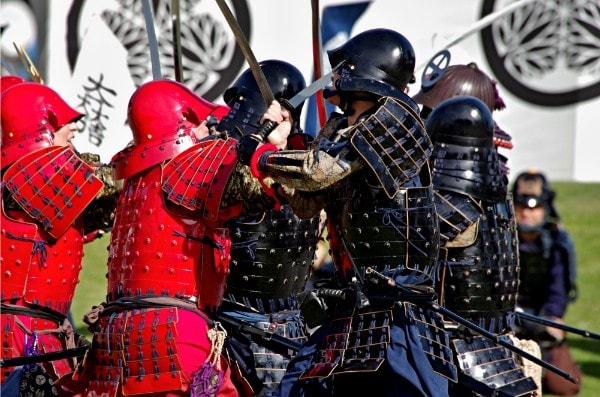 入り乱れる両軍の将兵たちは、それぞれに革具を身につけて、武器を振りかざした。武器と武器がぶつかり合い、刃先から火花が散った。日本を二分する大決戦にふさわしく、激しい戦闘が続いた。