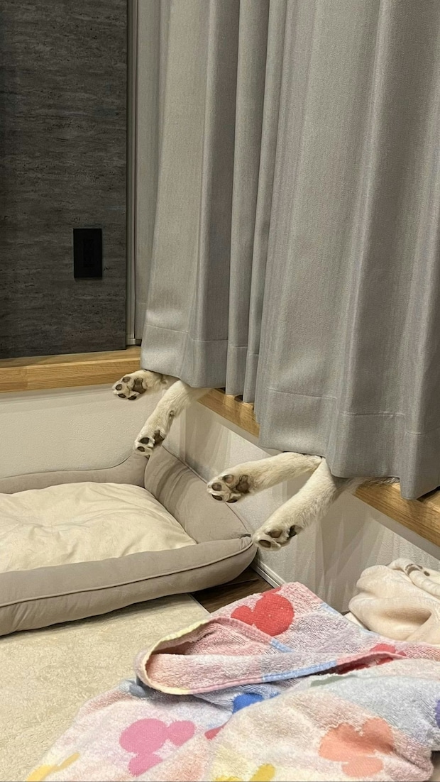 ひょこっと見えている足のおかげで、どこにいるのか一目瞭然。あそこで気持ちよさそうにくつろいでいる(寝ている)のかと思うと、とてもかわいらしいですよね。体をカーテンですっぽり隠している(つもりの)ようですが、これではすぐに見つかってしまいますね。もし一緒にかくれんぼをしたら、あっという間に見つけられてしまいそうです。