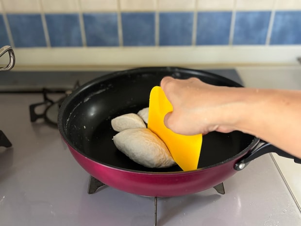 ※上記の工程でパン生地には火が通るのでここで終えてもOKですが、側面もカリッとさせたい場合は、菜箸で転がして側面も揚げ焼きにする