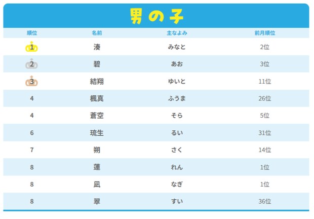 2025年10月生まれの男の子の名前ランキングTOP5は、1位「湊(みなと)」、2位「碧(あお)」、3位「結翔(ゆいと)」、同率4位「楓真(ふうま)」・「蒼空(そら)」でした。