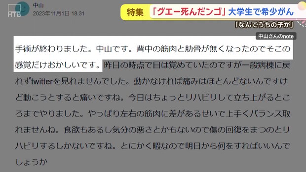 (noteより)「10月25日、がん発覚。手術で肋骨ごとごっそり取るらしい。太ももから皮膚移植する可能性もあるらしく、そうだったら術後痛いらしいのと数か月の入院が必要らしい」